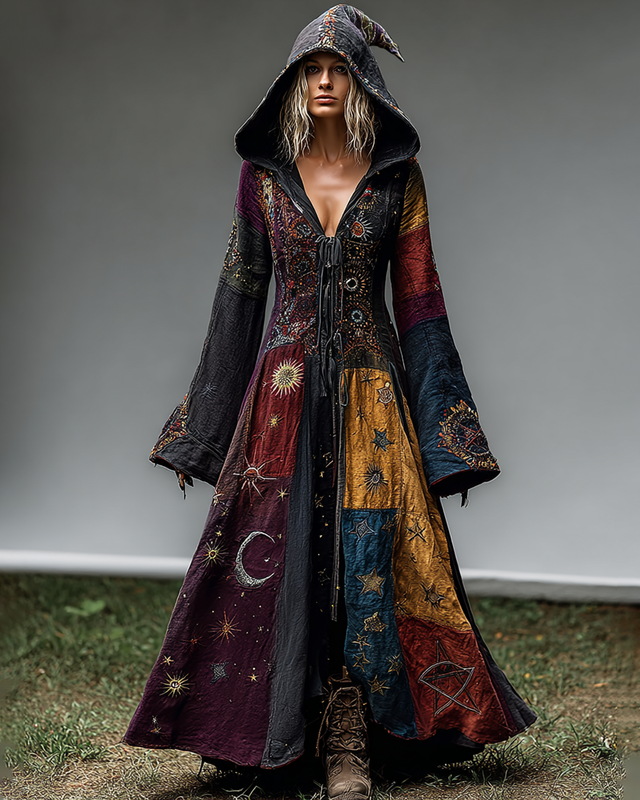 Halloween Themed Star And Moon Embroidery Patchwork Hooded Witch Dress a1fe