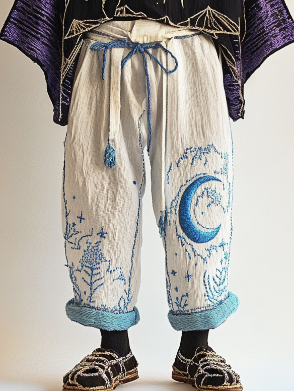 Men's Retro Star-Moon Cotton and Linen Lace-Up Pants 3d32