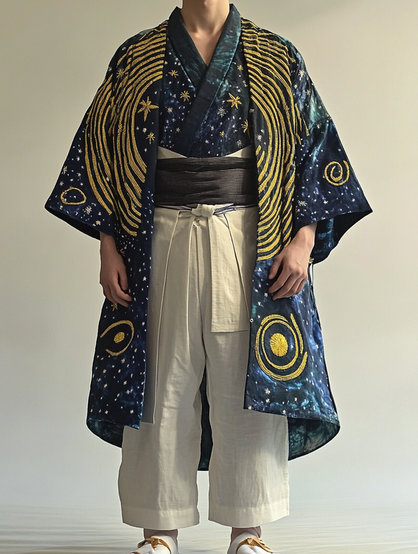 Men's Retro Star-Moon Cotton and Linen Lace-Up Top+Pants+Kimono Set c508